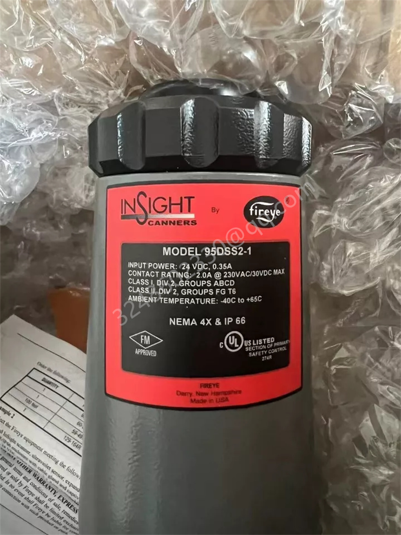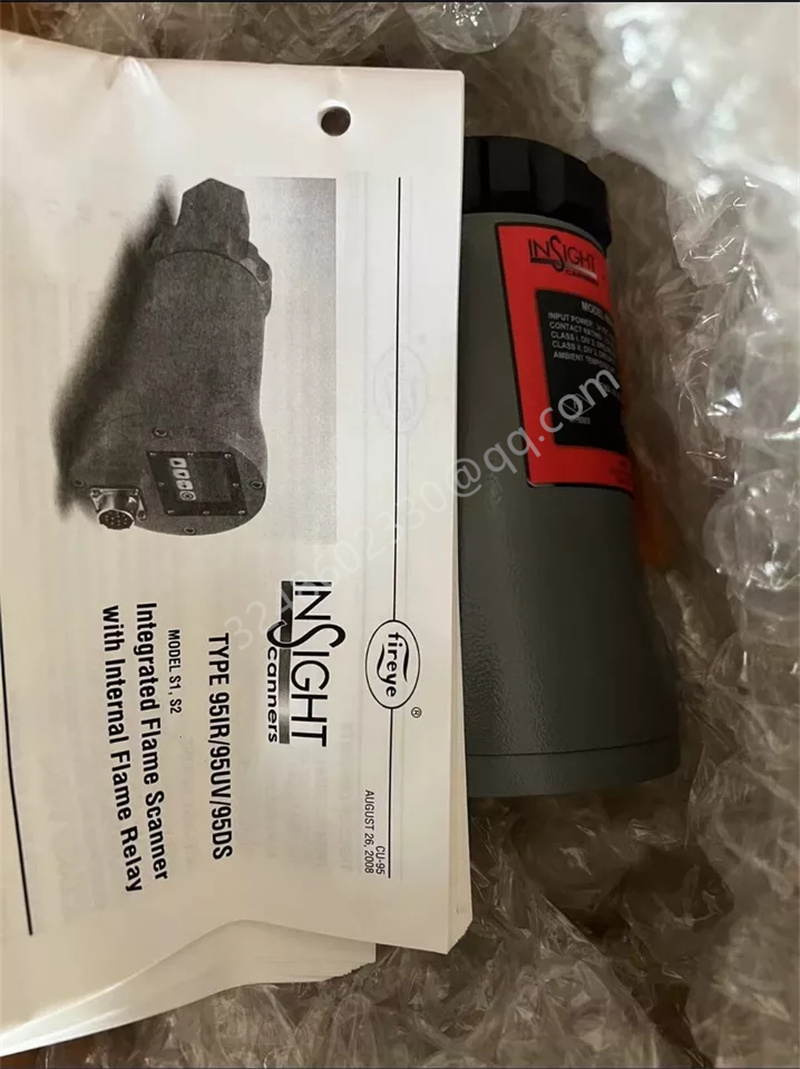 FIREYE 95DSS2-1 is a high-performance dual detector flame detector widely used in industrial combustion systems such as boilers, furnaces, and pipeline burners. technical specifications Sensor type: Dual sensors (infrared IR and ultraviolet UV). Shell material: cast aluminum die, silver polyester powder coating. Weight: Approximately 1.73 kg (3.8 lbs). Installation method: 1-inch NPT internal threaded pipe connection with locking ring for secure fixation; Supports fiber optic connections. Cooling air: clean, dry, low temperature; The air volume is usually 10 SCFM (17 Nm 3/hr); The wind pressure is usually 6 inches of water column (4.95 mbar), which needs to be higher than the furnace pressure. Working temperature: -40 ℉ to+150 ℉ (-40 ℃ to+65 ℃). Humidity: 0% to 95% relative humidity (non condensing). Input power supply: 24Vdc (+10%, -15%). Electrical connection: 12 pin, 1/4 turn quick open connector. Relay output: flame relay SPST (normally open contact); Fault signal relay SPST (normally closed contact). Analog output: 4-20mA DC current output (24VDC, maximum load 750 ohms). Status display: Eight character LED display screen (scrolling display). Operation interface: Operated through four button style small keyboards. UV sensor wavelength range: 295~320 nm. IR sensor wavelength range: 700~1700 nm. Certification: ATEX certification, suitable for hazardous areas.