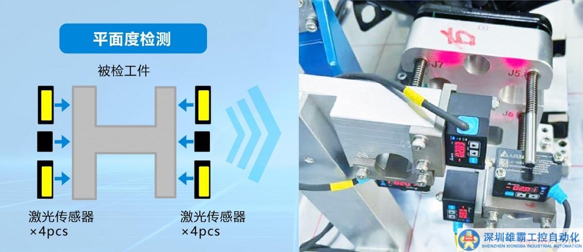 平面度檢測(cè):用于汽配設(shè)備,使用多顆激光傳感器同時(shí)測(cè)量被檢工件的不同點(diǎn)位置,通過對(duì)應(yīng)點(diǎn)的距離差值判斷工件平面度是否達(dá)標(biāo)。
