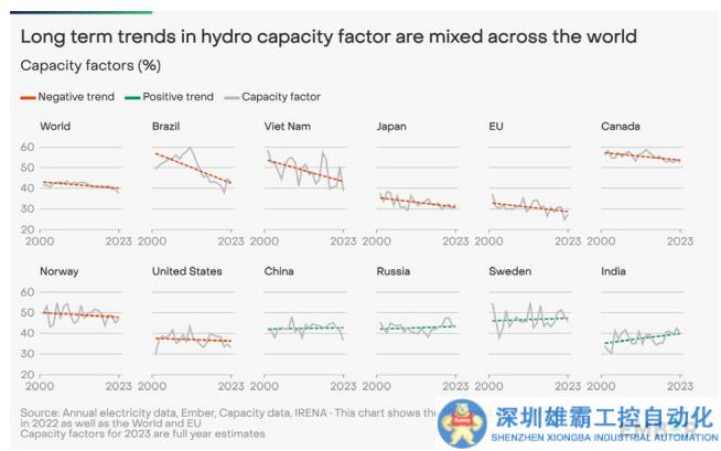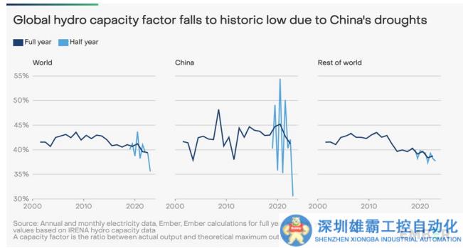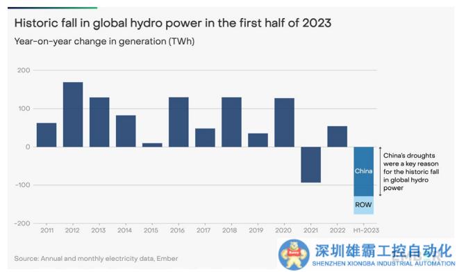 全球水力發(fā)電創(chuàng)下歷史性下降:由于干旱,作為所有可再生能源中最大的電力來源的水力發(fā)電,在2023年上半年出現(xiàn)了顯著下降(-8.5%,減少了1770億千瓦時)。這在中國尤為明顯,中國占全球水力發(fā)電下降量的四分之三左右?;剂习l(fā)電略微增加以彌補水力發(fā)電造成的缺口。如果全球水力發(fā)電量與去年相同,電力行業(yè)的排放量將下降2.9%。