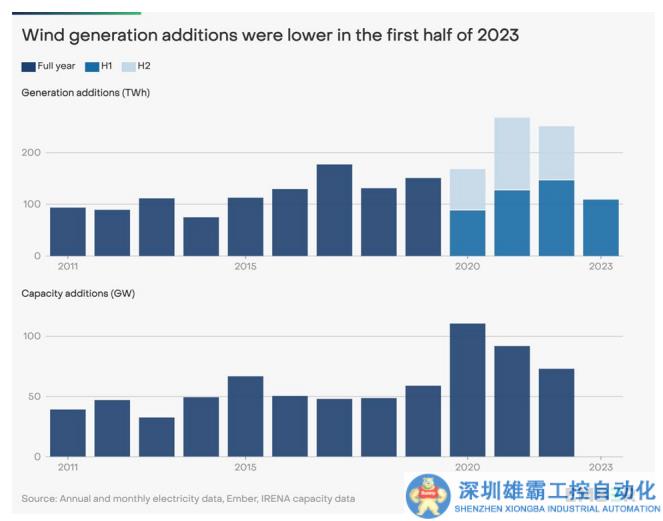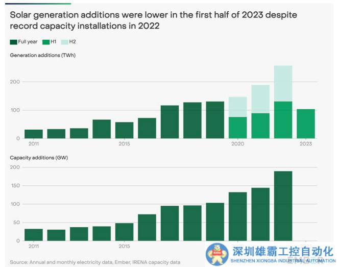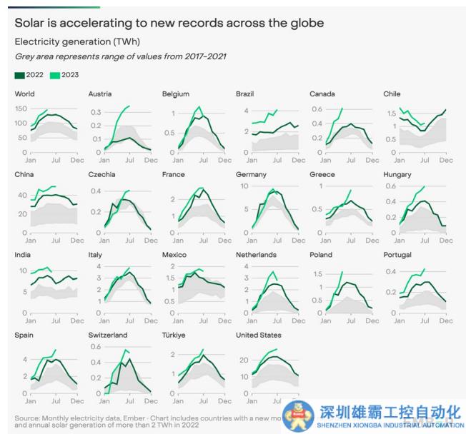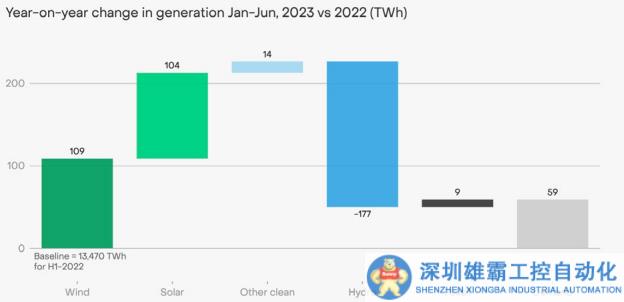 在2023年上半年,風能和太陽能是唯一兩種顯著增加其全球電力份額的電源,從去年同期的12.8%增長到14.3%。發(fā)電增長速度比去年同期慢。2023年上半年,風能增長了10%,而去年同期增長了16%。太陽能增長了16%,而去年同期增長了26%。在全球范圍內(nèi),有50個國家在2023年上半年創(chuàng)下了新的月度太陽能發(fā)電記錄。