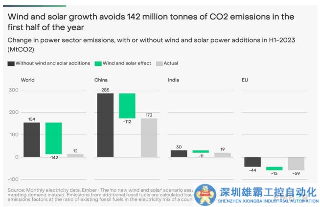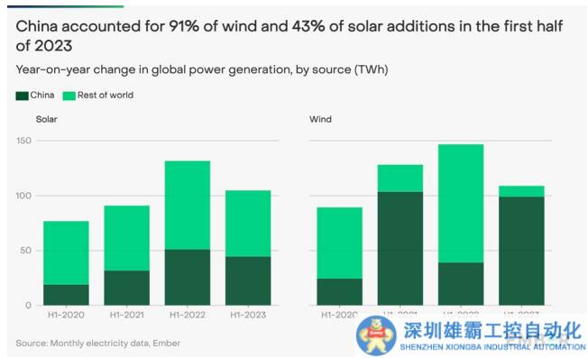在2023年上半年,中國占據(jù)了全球風能發(fā)電增長的91%和太陽能發(fā)電增長的43%。其次是歐盟和印度,分別貢獻了全球太陽能發(fā)電增長的12%。