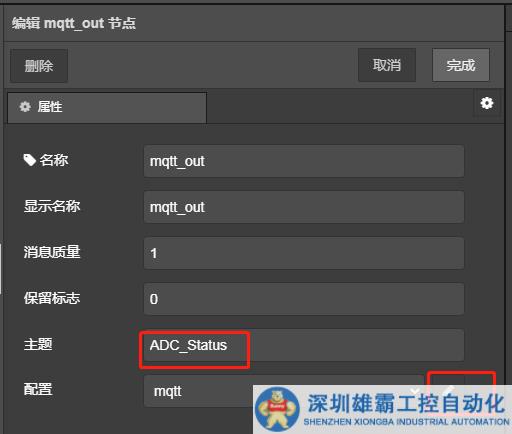 接著雙擊adc排頭的mqtt_out節(jié)點,編輯發(fā)布的MQTT主題,以及對mqtt_config進行配置。