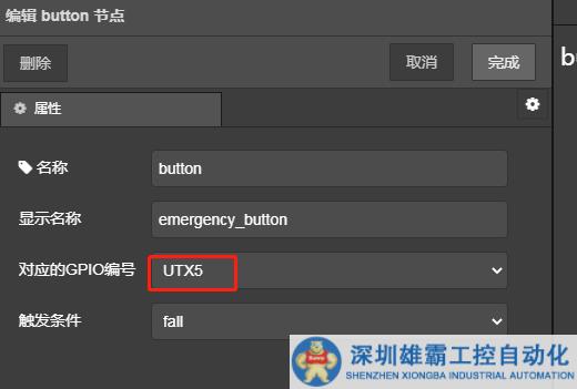 雙擊button節(jié)點,選擇目標板對應按鍵絲印的GPIO編號。