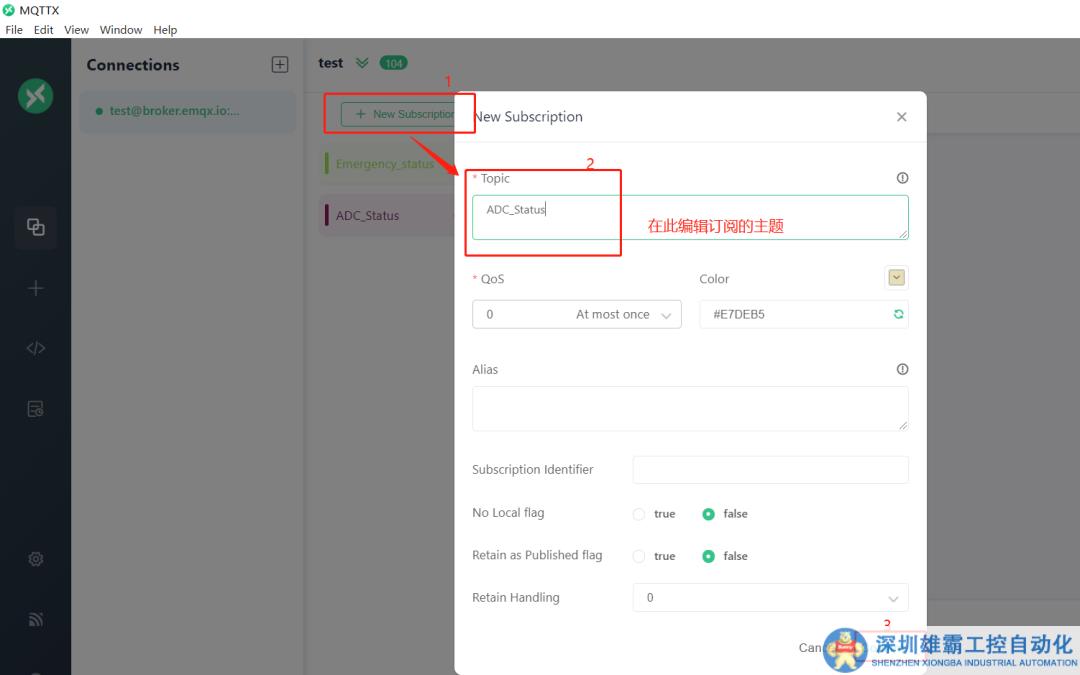 連接成功后,點擊New Subscription按鈕,在彈窗的Topic編輯框中填寫客戶需要訂閱的主題名稱,填寫后點擊Confirm確認,則訂閱成功。