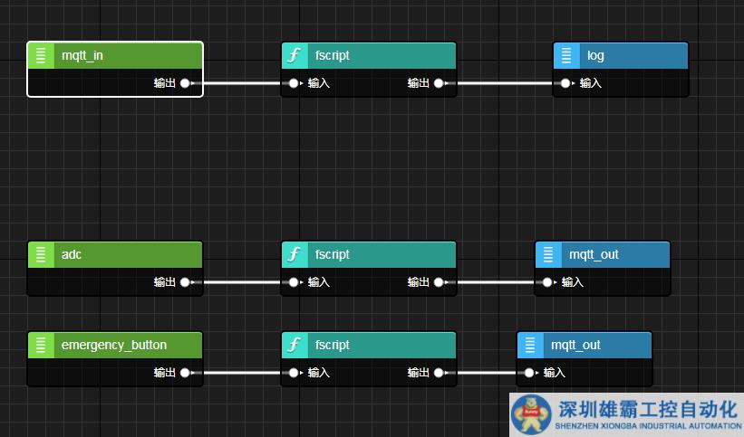 添加mqtt_in,fscript,log,adc,mqtt_out,button節(jié)點到畫布中并連線如下圖。