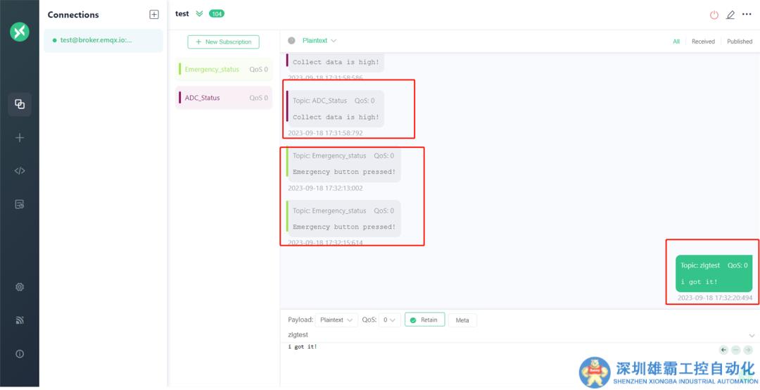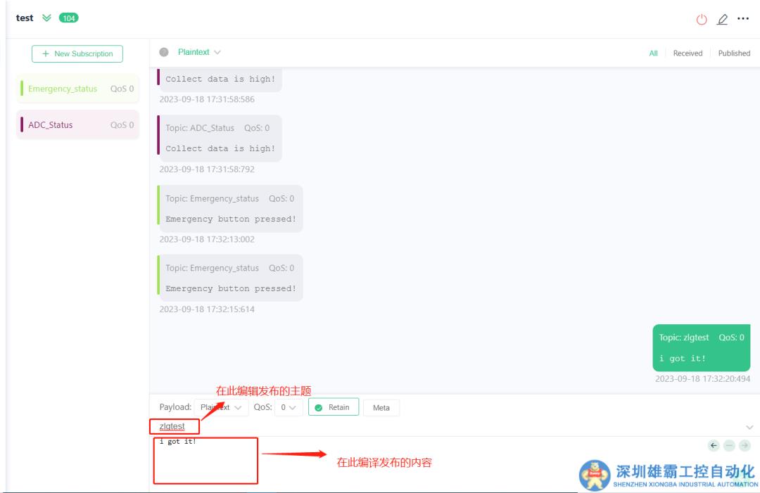 MQTTX客戶端發(fā)布zlgtest的主題,可以在核心板上的打印查看發(fā)布主題的消息內(nèi)容如下,也可以根據(jù)客戶端發(fā)布主題的消息對設(shè)備進行控制等操作。