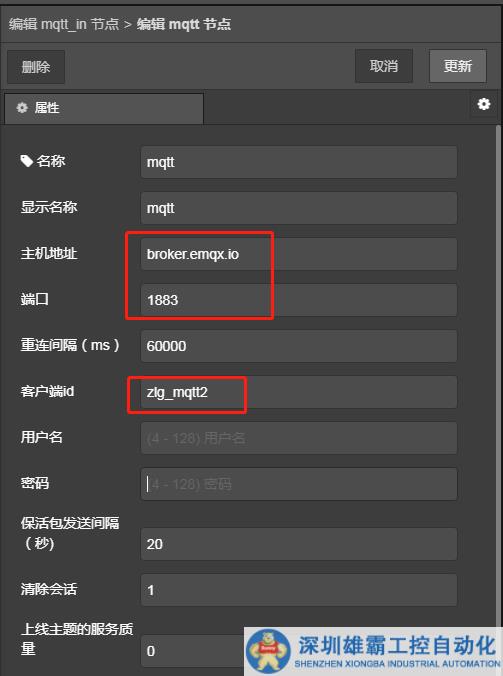 在mqtt_config配置節(jié)點中,可以只對主機地址,端口以及客戶端id進行配置,如下圖,因為本流圖所有的mqtt_config節(jié)點配置值都相同,后面不再贅述。