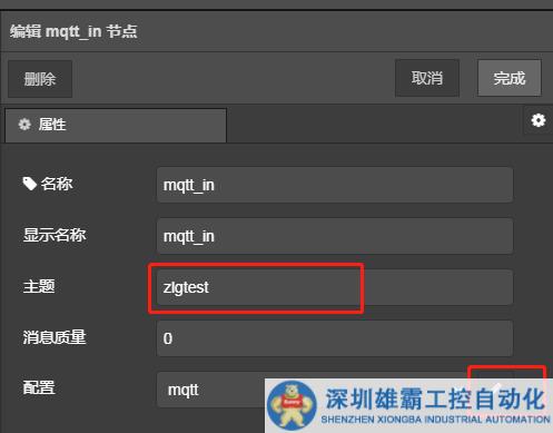 雙擊mqtt_in節(jié)點,配置訂閱的主題以及點擊配置的鉛筆圖標對mqtt_config配置節(jié)點進行配置。
