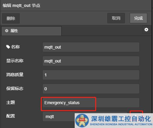雙擊button按鍵排頭的mqtt_out節(jié)點,對發(fā)布主題和mqtt_config進行配置。