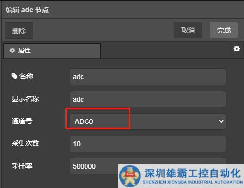 雙擊adc節(jié)點?,選擇目標板對應絲印的ADC通道號。