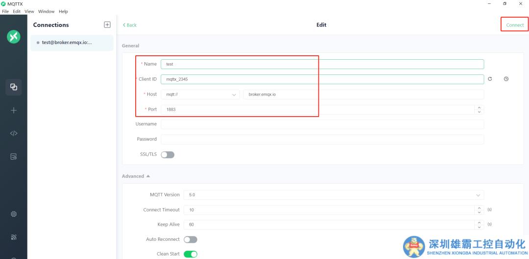 在官網(wǎng)下載并安裝MQTTX,一款開源跨平臺MQTT協(xié)議的桌面客戶端。在使用過程中不需要自行部署MQTT服務(wù)器,使用以下代理地址和端口號就能進行快速測試,MQTT代理地址:broker.emqx.io,端口號:1883(TCP);8883(SSL)。