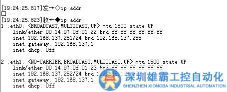 打開串口調(diào)試助手檢索并打開TTL轉(zhuǎn)USB串口模塊的設(shè)備端口號后,使用shell命令ip addr,查看網(wǎng)口的ip地址,根據(jù)下圖可知,本文使用的網(wǎng)口設(shè)備ip地址是192.168.137.251。