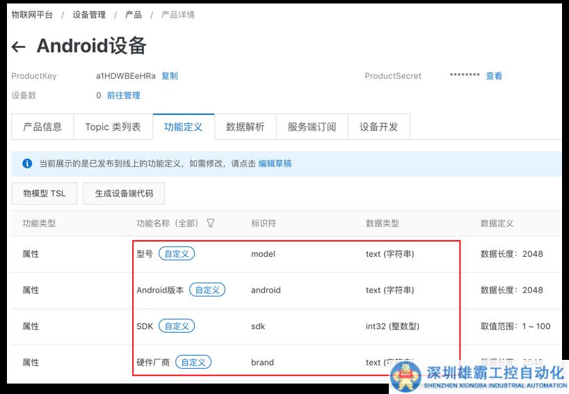 3.在產(chǎn)品詳情添加功能定義(物模型),我們以采集Android設(shè)備的硬件廠商、型號、Android版本、SDK版本信息為例: