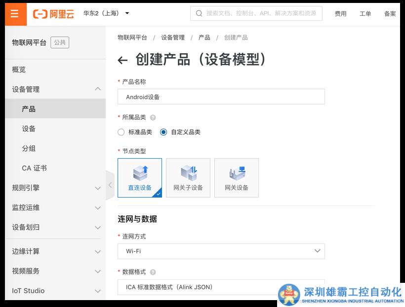 2.創(chuàng)建產(chǎn)品,選擇自定義品類,直連設(shè)備: