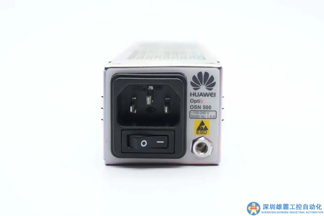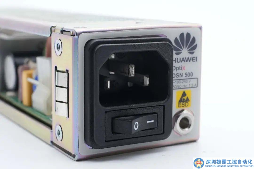 電源線插口右側(cè)區(qū)域有華為品牌logo、OptiX OSN500以及100-240V~50/60Hz 1.5A輸入?yún)?shù),下方是黃黑色的ESD標識。