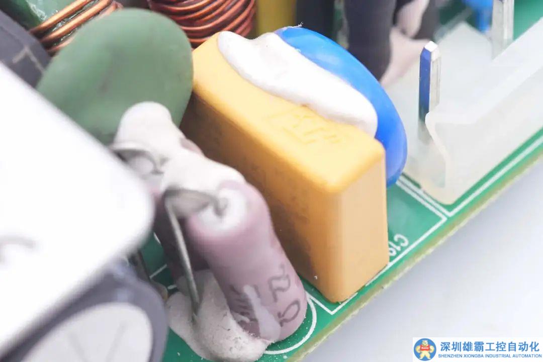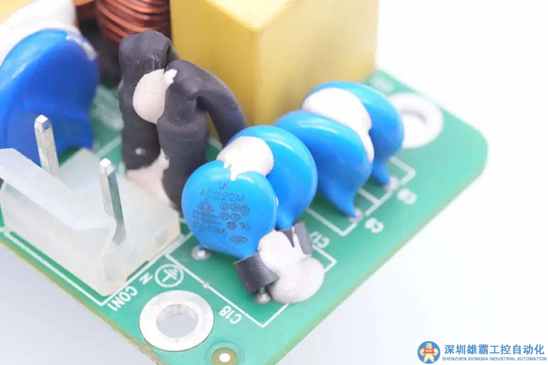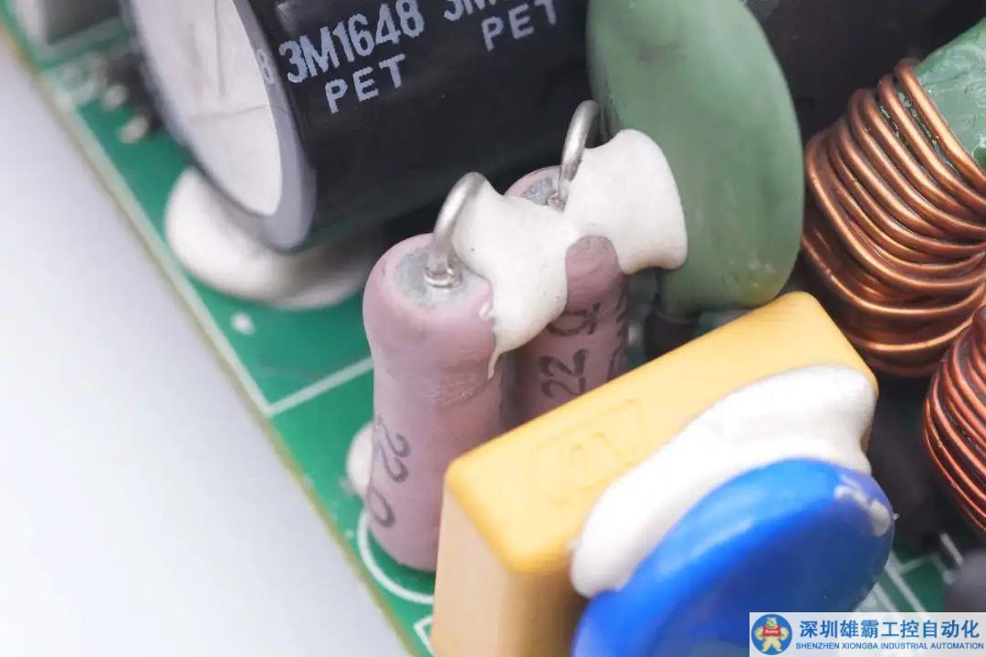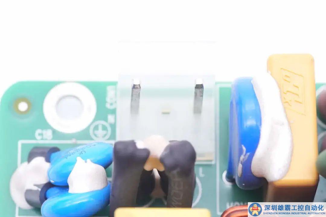 安規(guī)X2電容特寫,與壓敏電阻之間通過膠水粘接固定。