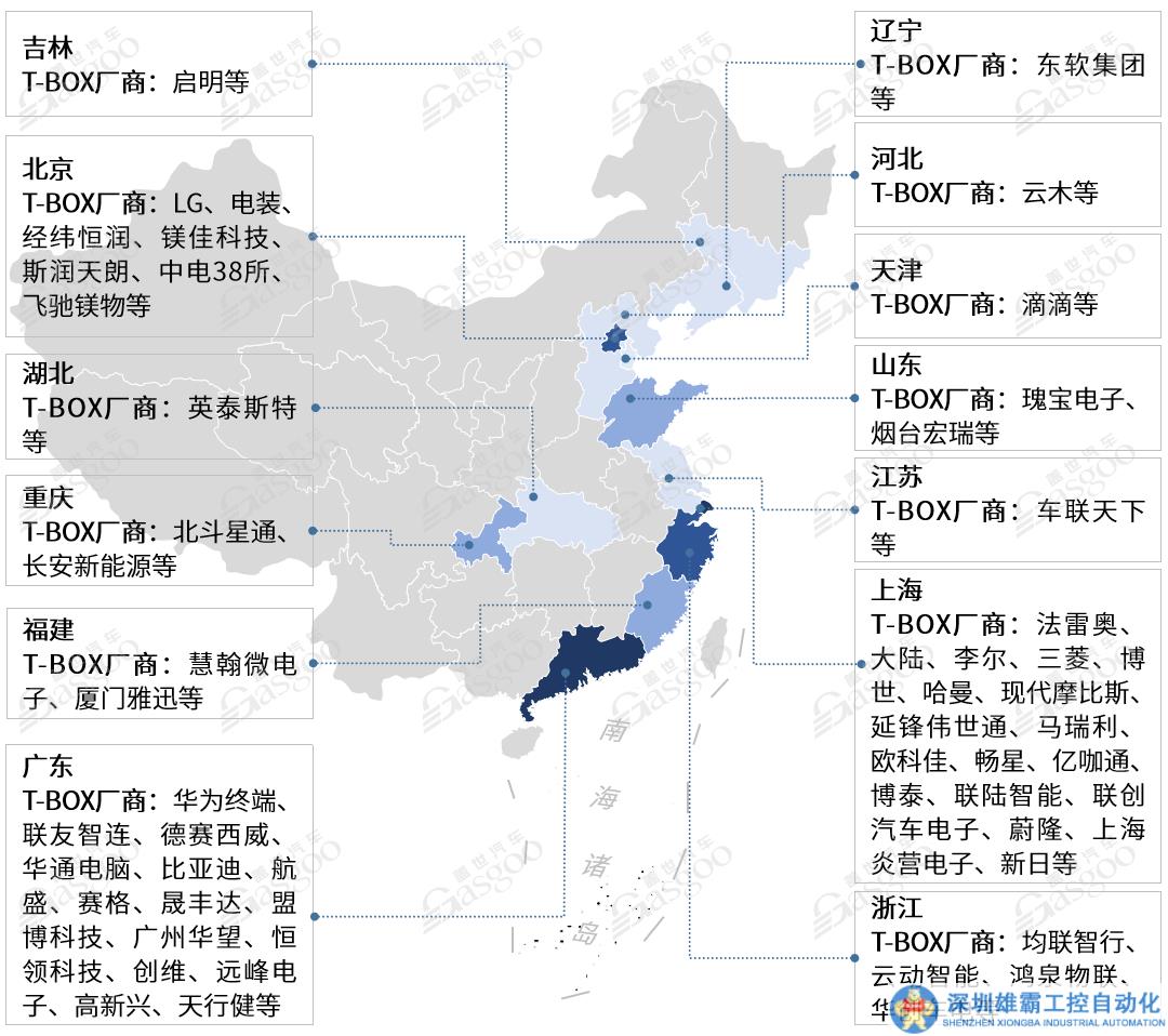 T-BOX行業(yè)經(jīng)過(guò)多年發(fā)展,已出現(xiàn)了眾多具備資質(zhì)的供應(yīng)商,相關(guān)代表性企業(yè)主要分布于上海、廣東及北京等高新技術(shù)較為集中的地區(qū),其他T-BOX企業(yè)則廣泛分布于東部沿海地區(qū)。