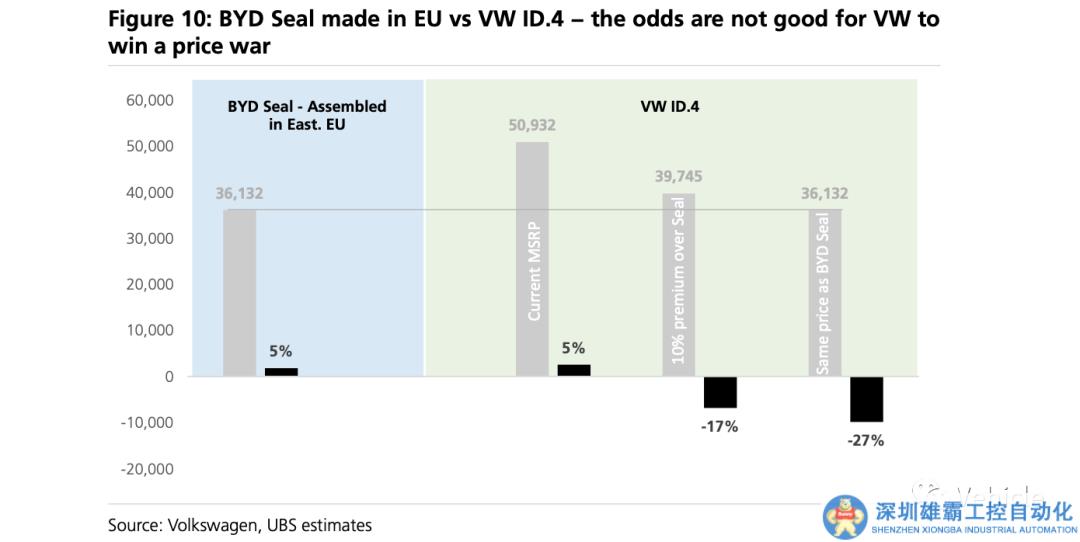 就拿比亞迪海豹(假設它在東歐組裝)和大眾ID.4(德國制造)之間的比較說明了這一點。按同等價格計算銷售,大眾每輛車的息稅前利潤將損失約1萬美元。
