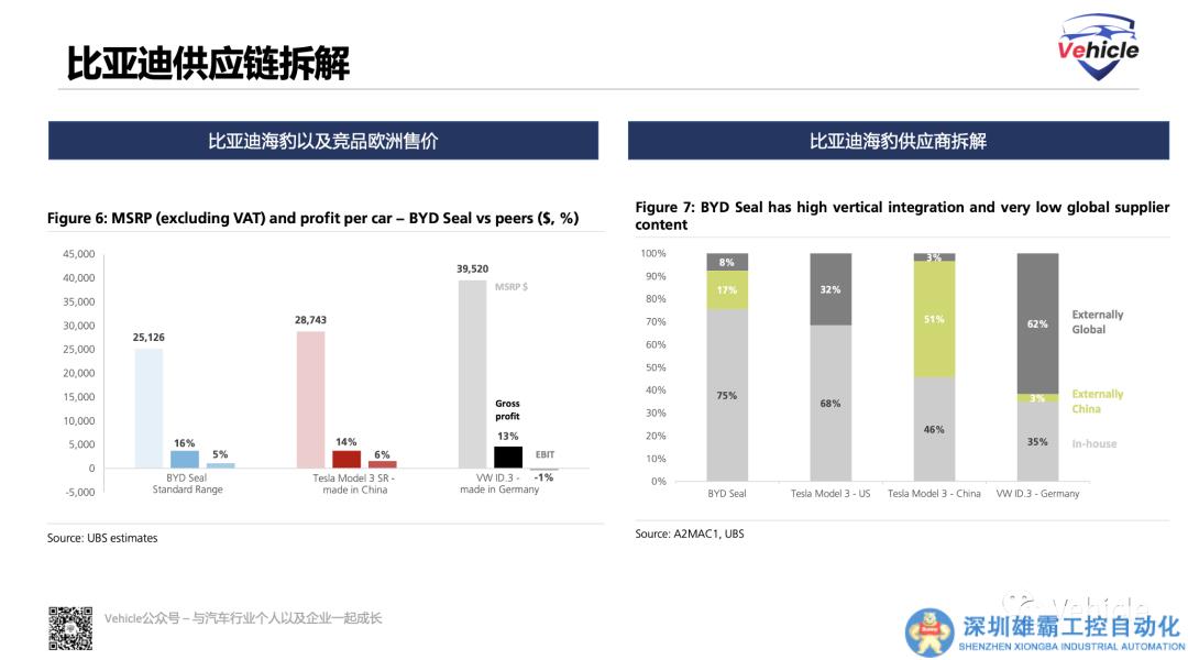 通過拆解比亞迪海豹,瑞銀UBS發(fā)現(xiàn)比亞迪的供應鏈垂直整合以及超過90%零件來自于國內,將近80%零件自制構成了比亞迪成本優(yōu)勢的法寶。比亞迪垂直整合使其成本處于行業(yè)領先地位: