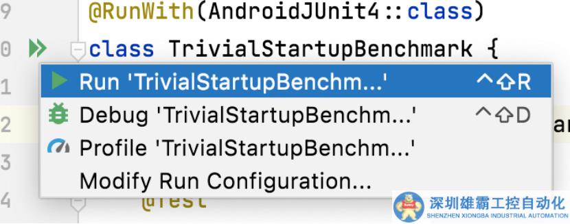 在Android Studio中運(yùn)行測(cè)試,以衡量應(yīng)用在設(shè)備上的性能。可以像使用測(cè)試類或方法旁邊的邊線操作運(yùn)行任何其他 `@Test` 一樣運(yùn)行基準(zhǔn),如下圖所示。