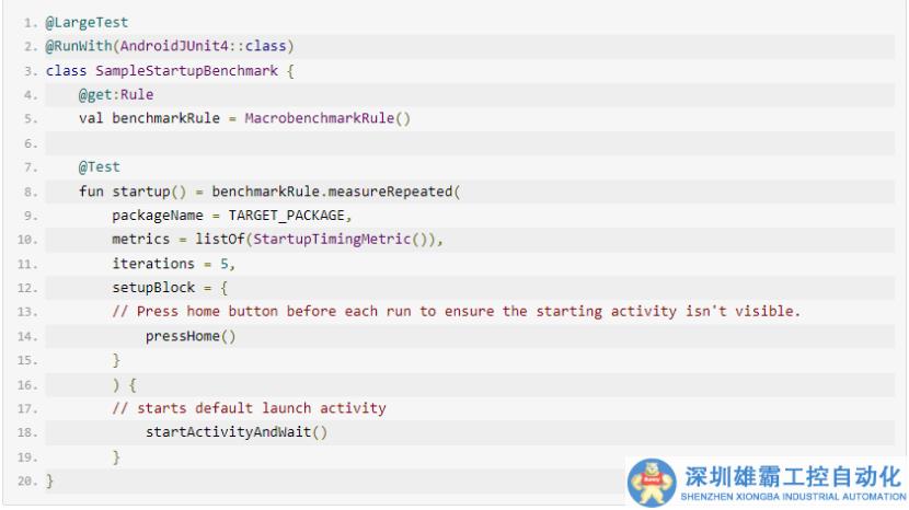 比如我們現(xiàn)在需要對(duì)App應(yīng)用啟動(dòng)時(shí)間進(jìn)行監(jiān)控。則可以在Macrobenchmark Module編寫一個(gè)測(cè)試用例類,在測(cè)試用例類中編寫測(cè)試用例方案,如測(cè)量5次打開應(yīng)用時(shí)間。