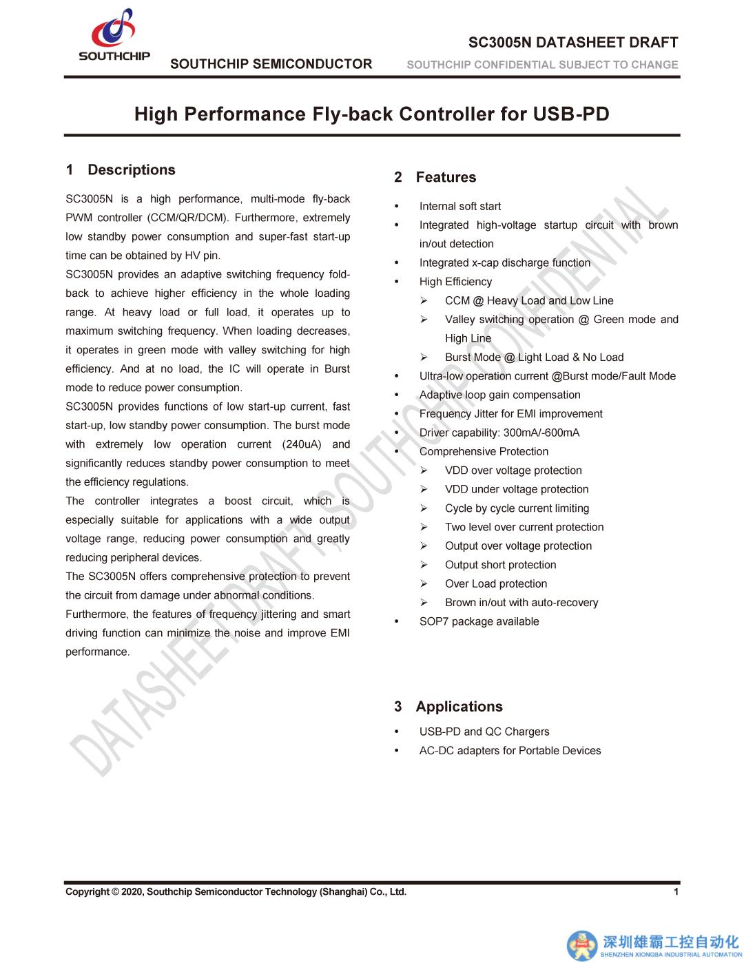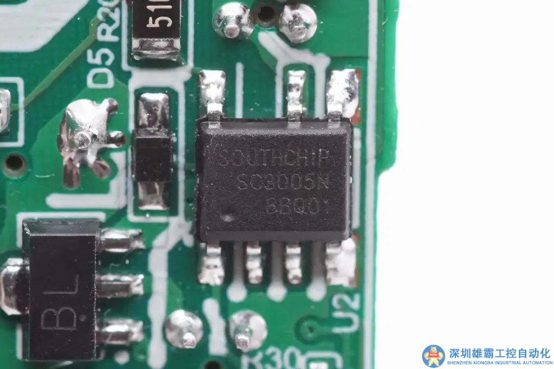 初級(jí)控制器來自南芯科技,型號(hào)SC3005N,是一顆高性能多模式反激控制器,具備極低的待機(jī)功耗和超快的啟動(dòng)速度。芯片具備自適應(yīng)開關(guān)頻率折返功能,可在整個(gè)負(fù)載范圍內(nèi)獲得高轉(zhuǎn)換效率。在滿載時(shí)以最高開關(guān)頻率運(yùn)行。