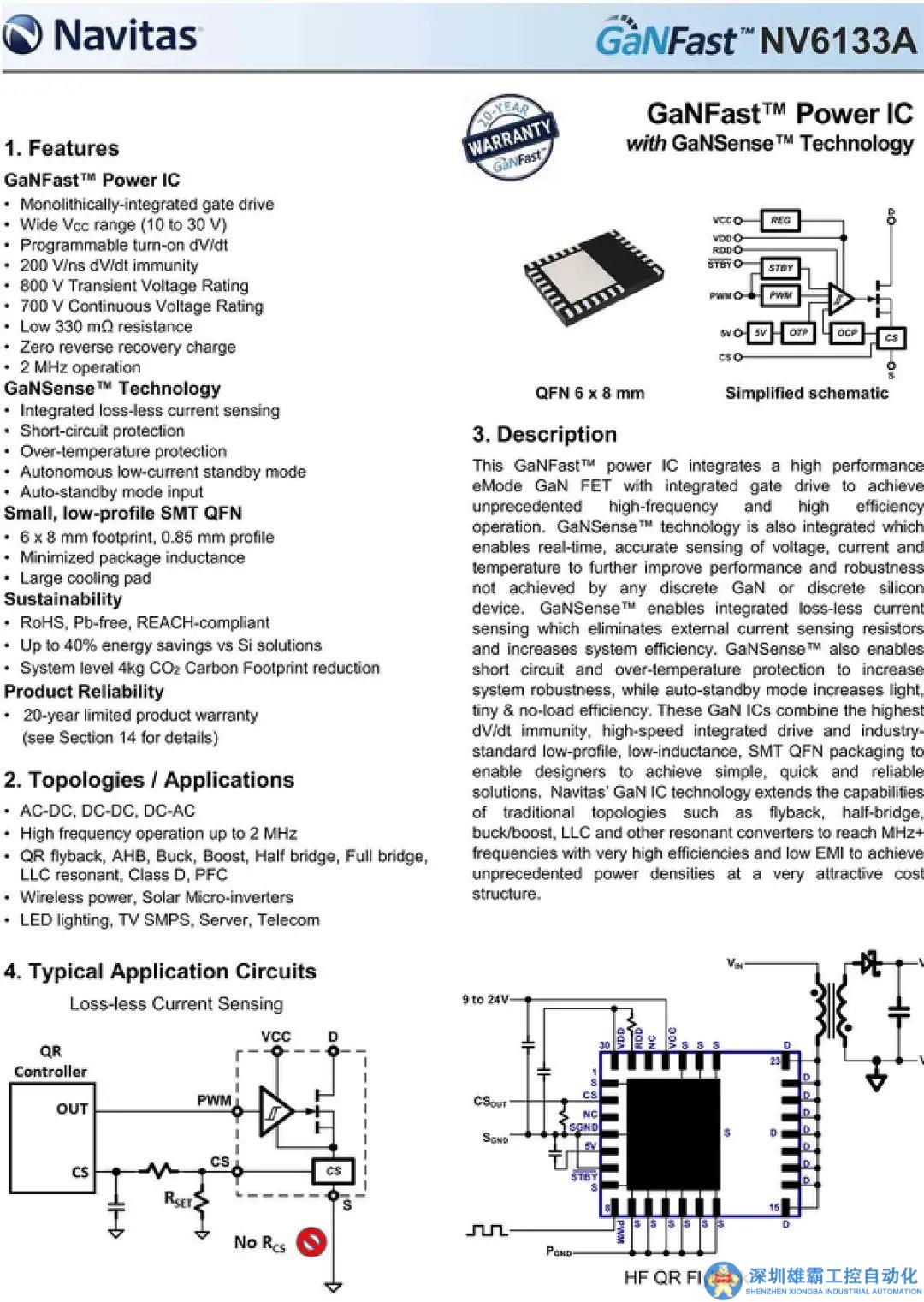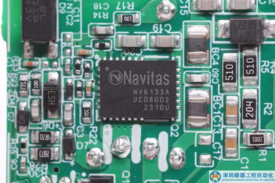 功率芯片來自納微半導(dǎo)體,型號(hào)NV6133A,芯片內(nèi)置驅(qū)動(dòng)器,國(guó)產(chǎn)開關(guān)管和高精度無損電流采樣電路,芯片內(nèi)置的國(guó)產(chǎn)開關(guān)管導(dǎo)阻為330mΩ,耐壓700V,支持2MHz開關(guān)頻率。NV6133A采用QFN6*8mm封裝,節(jié)省面積。
