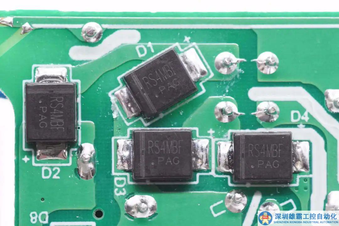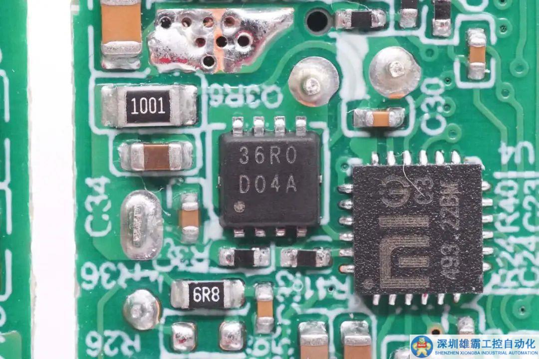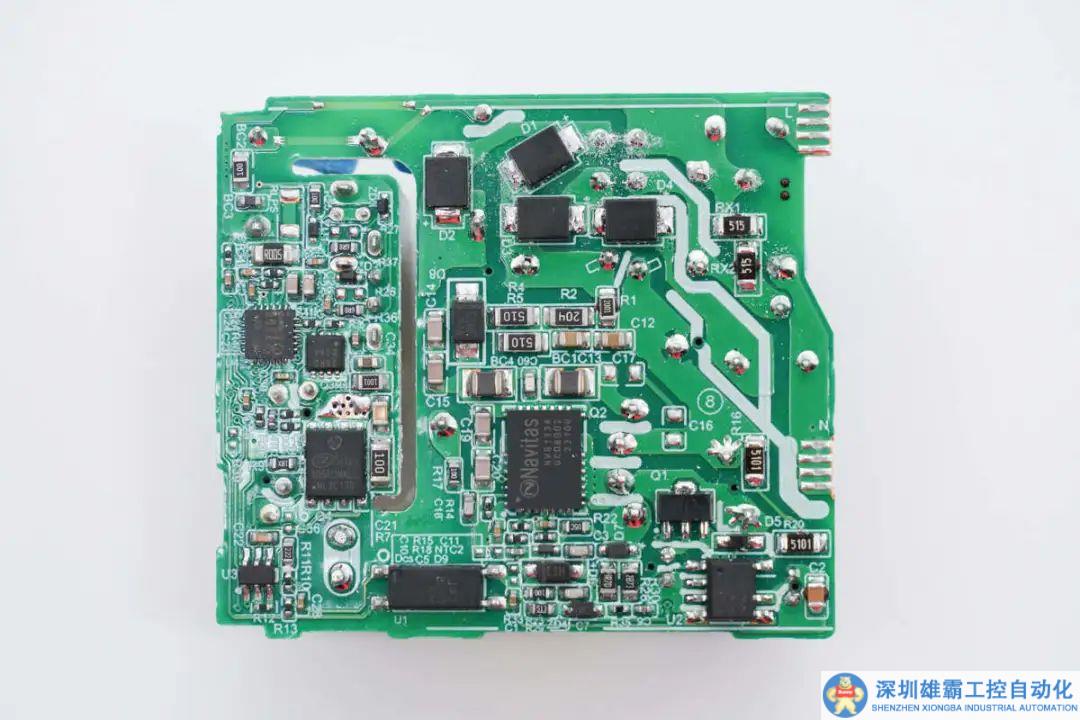 PCBA模塊背面焊接四顆二極管組成的整流橋,國(guó)產(chǎn)主控芯片,氮化鎵功率芯片,反饋光耦。次級(jí)焊接同步整流控制器,同步整流管,協(xié)議芯片和VBUS開關(guān)管。