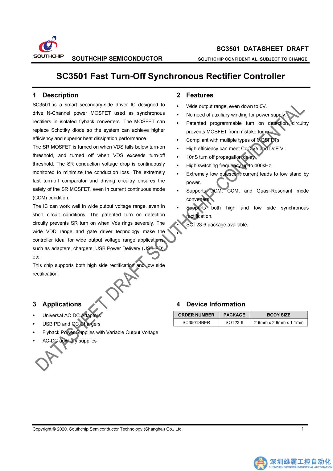 同步整流控制器來自南芯科技,型號(hào)SC3501,是一顆自適應(yīng)開通檢測(cè)和快速關(guān)斷同步整流控制器,無需輔助線圈供電,輸出電壓最高可達(dá)22V,最低可低至0V,滿足PD快充應(yīng)用。專利的自適應(yīng)開通檢測(cè)電路避免同步整流管誤開通,兼容多種MOS,具有超低的靜態(tài)電流,支持多種工作模式,支持高側(cè)和低側(cè)同步整流,外圍元件非常精簡(jiǎn)。