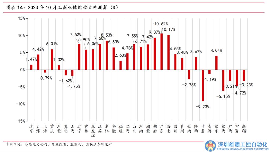 另據(jù)國聯(lián)證券研究所的儲能收益率模型測算,2023年10月,大多數(shù)省份儲能收益率在1%-10%之間,其中,廣東收益率最高為10.62%。
