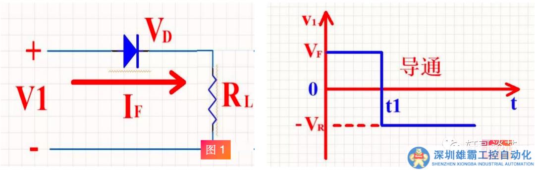 在上圖1 中的硅二極管電路中加入一個(gè)輸入電壓 V1?。在時(shí)間 t0?-?t1 過程中,輸入為+VF,二極管處于導(dǎo)通狀態(tài),電路回路中有電流流過。