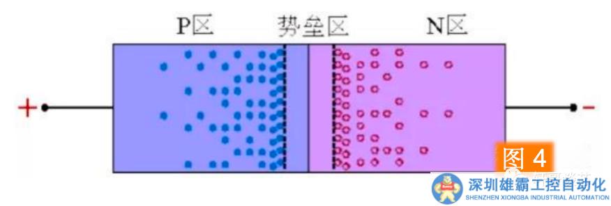 當(dāng)外加正向電壓時(shí),P區(qū)的空穴向N區(qū)擴(kuò)散,N區(qū)的電子向P區(qū)擴(kuò)散。這樣,不僅使勢(shì)壘區(qū)(耗盡區(qū))變窄,而且載流子有相當(dāng)數(shù)量的剩余存儲(chǔ),在P區(qū)內(nèi)存儲(chǔ)了電子,而在N區(qū)內(nèi)存儲(chǔ)了空穴,它們都是非平衡少數(shù)載流子,如下圖4 所示。