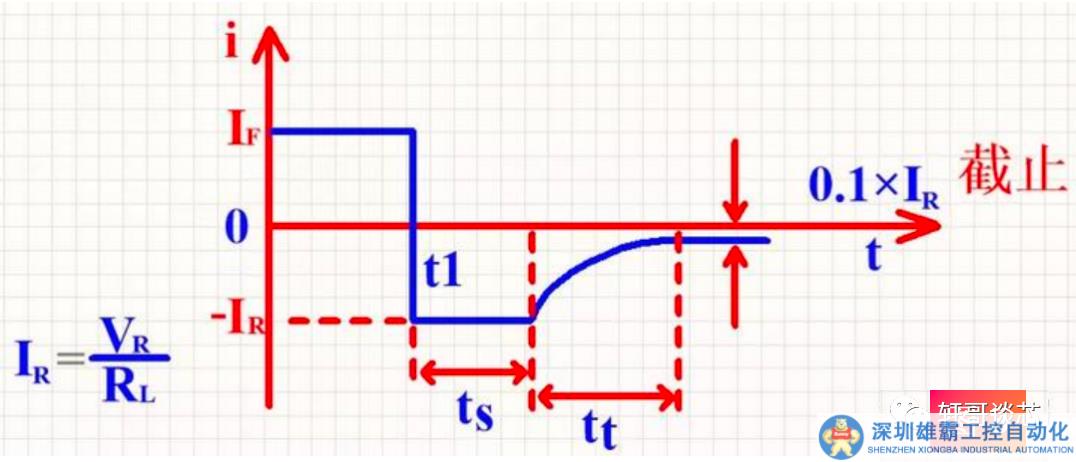但實(shí)際情況是,二極管并不能立刻截止,而是先由正向的IF?變到一個(gè)很大的反向電流?IR = VR/RL,這個(gè)電流維持一段時(shí)間ts?后才開始逐漸下降,再經(jīng)過tt?后,下降到一個(gè)很小的數(shù)值,也就是最終的反向漏電流,這時(shí)二極管才進(jìn)入反向截止?fàn)顟B(tài),如下圖 3所示。