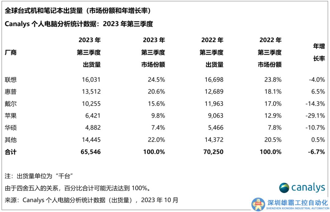 2023年第三季度, 全球個人電腦市場繼續(xù)回升。盡管個人電腦的總出貨量為6,560萬臺,同比下滑7%,但較二季度,回升了8%。本季度的出貨量創(chuàng)下近一年內(nèi)的最低跌幅,進一步體現(xiàn)了庫存水平的恢復(fù)和相關(guān)需求的反彈。筆記本的出貨量同比下滑6%至5,210萬部,而臺式機的出貨量則下跌8%至1,350萬部。