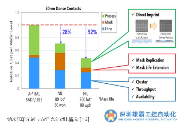 佳能的研究顯示,其設備在每小時 80 片晶圓的吞吐量和 80 片晶圓的掩模壽命下,納米壓印光刻相對 ArF 光刻工藝可降低 28% 的成本,隨著吞吐量增加至每小時 90 片,掩模壽命超過 300 批次,成本可降低 52%。此外,通過改用大場掩模來減少每片晶圓的拍攝次數(shù),還可進一步降低成本。