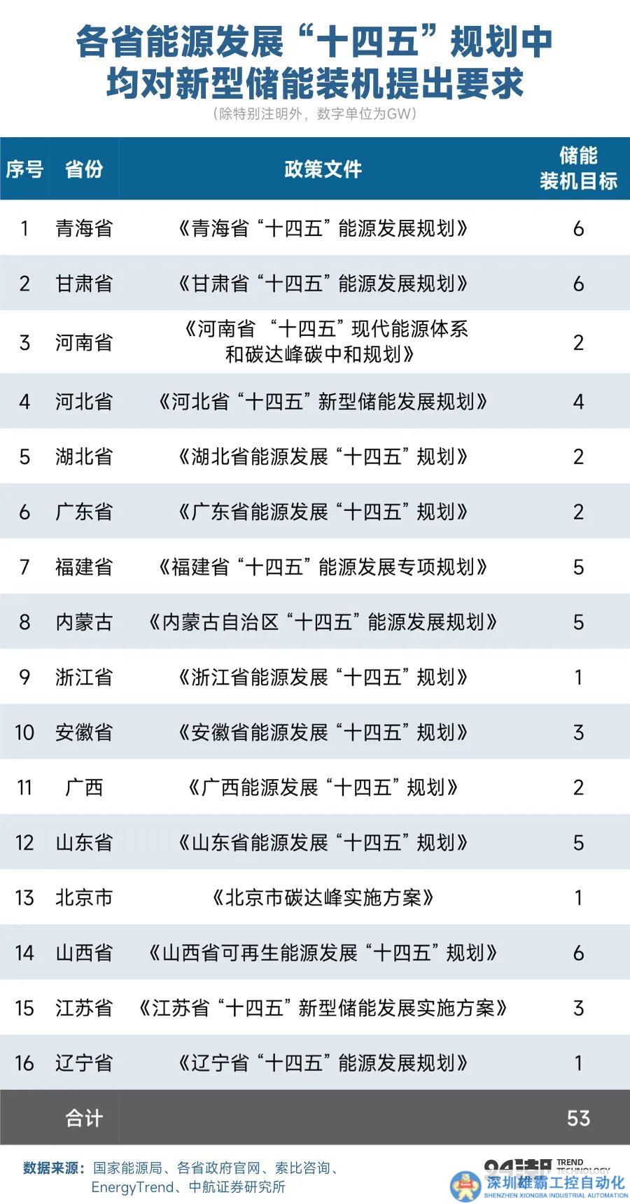 根據(jù)2021年發(fā)改委與能源局頒發(fā)的《關(guān)于加快推動(dòng)新型儲(chǔ)能發(fā)展的指導(dǎo)意見》,從國家層面制定2025年新型儲(chǔ)能30GW的裝機(jī)目標(biāo)。隨著各省十四五能源規(guī)劃的出臺(tái),至十四五末期,全國新型儲(chǔ)能裝機(jī)規(guī)模有望達(dá)到53GW。