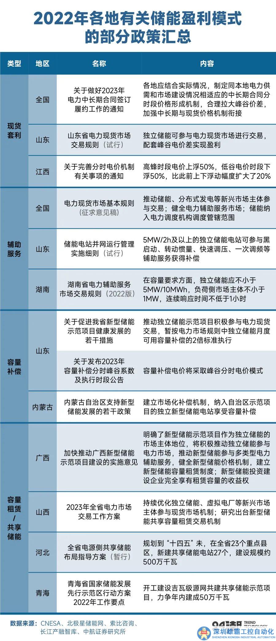 在國內(nèi),政策上也在鼓勵(lì)發(fā)展獨(dú)立電站新商業(yè)模式。比如2022年5月兩部委印發(fā)的《 “十四五” 可再生能源發(fā)展規(guī)劃》明確新型儲(chǔ)能可作為獨(dú)立儲(chǔ)能參與電力市場,加快推動(dòng)獨(dú)立儲(chǔ)能參與電力市場配合電網(wǎng)調(diào)峰、充分發(fā)揮獨(dú)立儲(chǔ)能技術(shù)優(yōu)勢提供輔助服務(wù),2022年11月國家能源局發(fā)布《電力現(xiàn)貨市場基本規(guī)則(征求意見稿)》,首次在全國層面提及推進(jìn)電力現(xiàn)貨市場,推動(dòng)儲(chǔ)能、分布式發(fā)電等新興市場主體參與交易。經(jīng)過 2021年的探索、2022年調(diào)峰示范項(xiàng)目的實(shí)踐,在各地政策的助推下,獨(dú)立式儲(chǔ)能電站已經(jīng)形成了較為穩(wěn)定的商業(yè)模式,現(xiàn)貨市場+輔助服務(wù)+容量補(bǔ)償?shù)氖杖肽J綄?dòng)國內(nèi)儲(chǔ)能行業(yè)向健康化發(fā)展。
