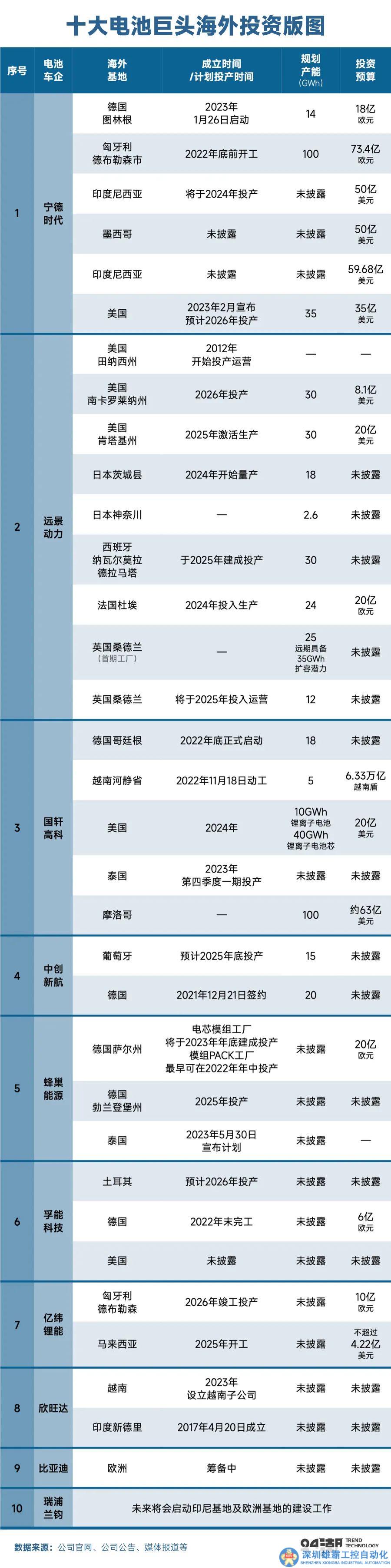 現(xiàn)實(shí)情況是,很多電池巨頭都在加速海外產(chǎn)能布局。據(jù)24潮團(tuán)隊(duì)不完全統(tǒng)計(jì),截至目前,國內(nèi)已有寧德時(shí)代、遠(yuǎn)景動(dòng)力、國軒高科、中創(chuàng)新航、蜂巢能源、孚能科技、億緯鋰能、欣旺達(dá)等10家動(dòng)力電池巨頭計(jì)劃或者已在海外有深度的產(chǎn)業(yè)布局,其公開對外披露的/媒體公開報(bào)道的項(xiàng)目達(dá)34個(gè),總投資預(yù)算超4000億元。