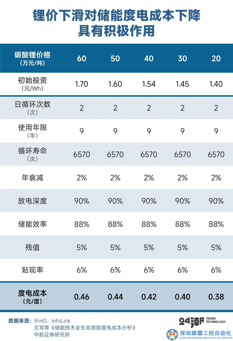 而目前鋰價(jià)的快速回落可能會(huì)進(jìn)一步加速電化學(xué)儲(chǔ)能的崛起。經(jīng)過中航證券測算,在使用年限9年、循環(huán)次數(shù)6500次左右情況下,若碳酸鋰價(jià)格降至20萬元/噸以下,儲(chǔ)能度電成本可降至0.38元左右。