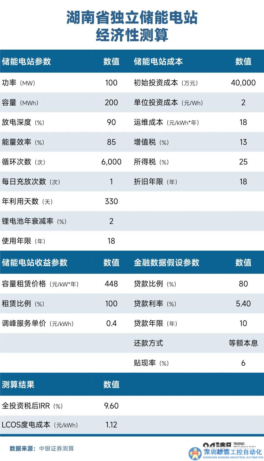 獨(dú)立儲(chǔ)能盈利模式主要包括現(xiàn)貨套利、輔助服務(wù)、容量補(bǔ)償和容量租賃四個(gè)方面。我們以湖南省的實(shí)際情況為例,來測算獨(dú)立儲(chǔ)能電站的經(jīng)濟(jì)性,在目前的各種條件下,湖南省獨(dú)立儲(chǔ)能電站的全投資稅后IRR達(dá)到9.60%,具有客觀的收益性:1、容量租賃收入假設(shè):參考湖南省的城步儒林100MW/200MWh儲(chǔ)能電站項(xiàng)目已經(jīng)簽訂的容量租賃合同,湖南省的容量租賃價(jià)格為448 元/kw*年;2、電力輔助服務(wù)收入假設(shè):電力輔助服務(wù)包括為電網(wǎng)公司提供調(diào)峰、調(diào)頻等服務(wù),按照每次調(diào)用規(guī)模及調(diào)用次數(shù),電網(wǎng)公司給儲(chǔ)能電站支付費(fèi)用。參考湖南省的現(xiàn)行政策以及城步儒林100MW/200MWh儲(chǔ)能電站項(xiàng)目的運(yùn)行情況,假設(shè)一年調(diào)用330天,每天一次充放,調(diào)用費(fèi)用為每次400元/MWh。