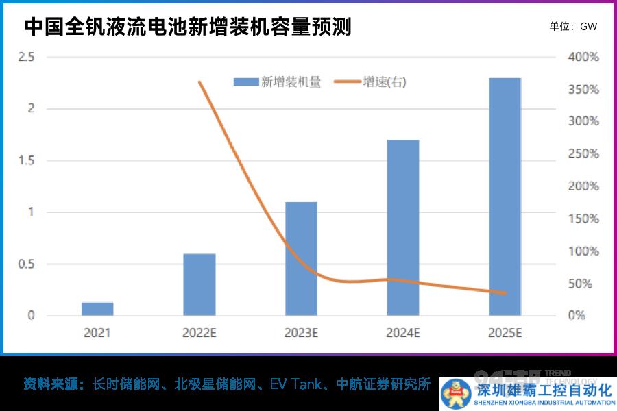 而液流電池儲(chǔ)能技術(shù)是利用正負(fù)極儲(chǔ)能活性物質(zhì)價(jià)態(tài)的變化來實(shí)現(xiàn)電能的儲(chǔ)存和釋放,具有靈活性高、壽命長、安全性高和環(huán)境友好等特點(diǎn)。在各類液流電池中,全釩液流電池目前在應(yīng)用規(guī)模和產(chǎn)業(yè)鏈方面最為突出,現(xiàn)已有百M(fèi)Wh級項(xiàng)目涌現(xiàn)。據(jù)EV Tank預(yù)計(jì),未來在國家扶持政策和產(chǎn)業(yè)鏈成熟化發(fā)展的推動(dòng)下,2025年釩電池新增裝機(jī)規(guī)模有望達(dá)2.3GW以上。