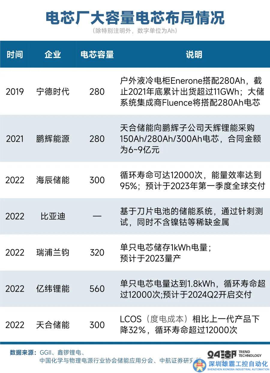 為適應(yīng)目前儲(chǔ)能豐富的應(yīng)用場景,同時(shí)降低成本,市場對于大容量儲(chǔ)能電芯需求旺盛,各電池廠紛紛針對儲(chǔ)能場景推出專用大容量電芯。自2020年開始,以寧德時(shí)代為代表的電池廠針對儲(chǔ)能業(yè)務(wù)陸續(xù)推出280Ah電芯,此類產(chǎn)品目前已成為儲(chǔ)能市場主流。
