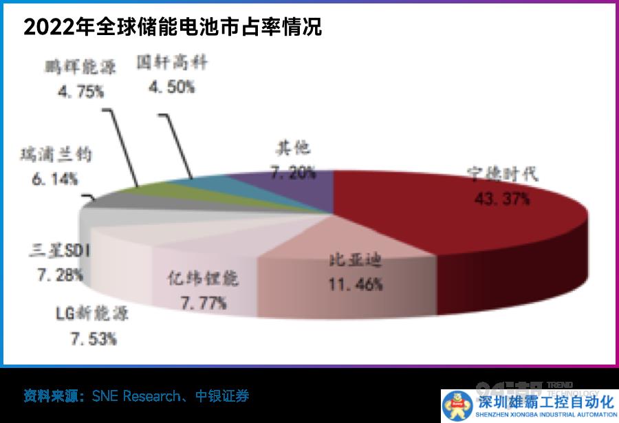 從2022年全球儲(chǔ)能市場的市占率來看,寧德時(shí)代出貨53GWh,全球市占率達(dá)到43.37%,其次是比亞迪出貨14GWh,市占率達(dá)到11.46%,其他廠商市占率均不超過10%。
