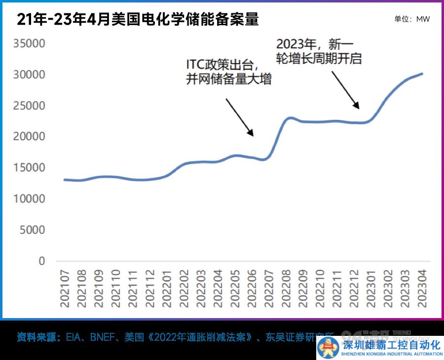 一系列政策確實(shí)帶動(dòng)美國電化學(xué)儲(chǔ)能備案量的躍升,截止23年4月備案量達(dá)30.2GW。(注:美國并網(wǎng)流程復(fù)雜、需排隊(duì),平均審批時(shí)間40-60個(gè)月。)