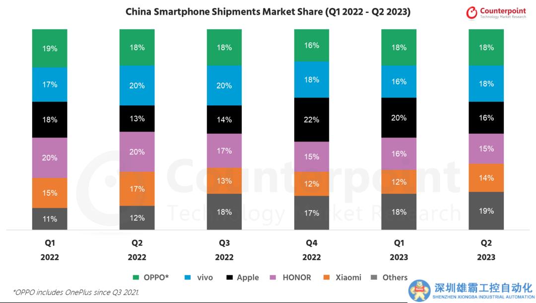 ▲2022年Q1至2023年Q2中國智能手機市場份額情況,來源:Counterpiont