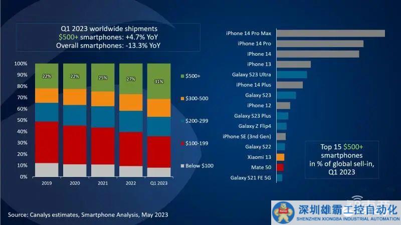 ▲2023年Q1全球500美元以上智能手機出貨量排名,來源:Canalys
