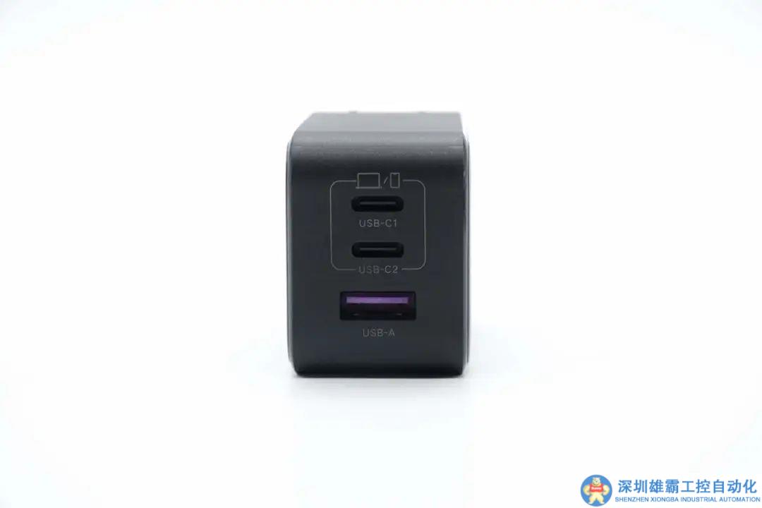 輸出端配有2C1A三個(gè)接口,接口旁不僅印有名稱,USB-C1口上方還印有筆電和手機(jī)標(biāo)識(shí),表明充電器可為對(duì)應(yīng)設(shè)備進(jìn)行快充。