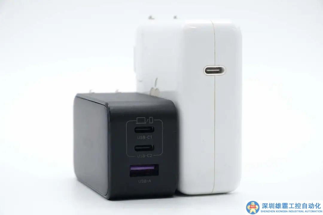 和蘋果61W充電器放在一起對(duì)比,體積優(yōu)勢(shì)明顯。