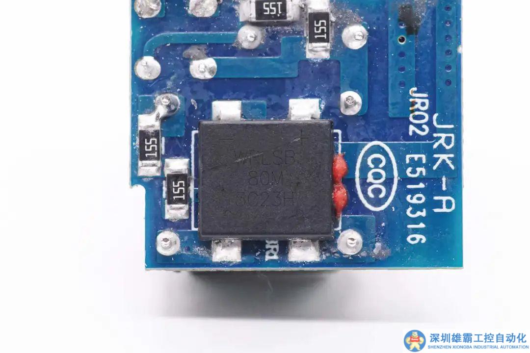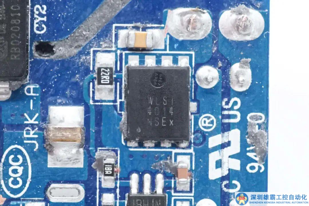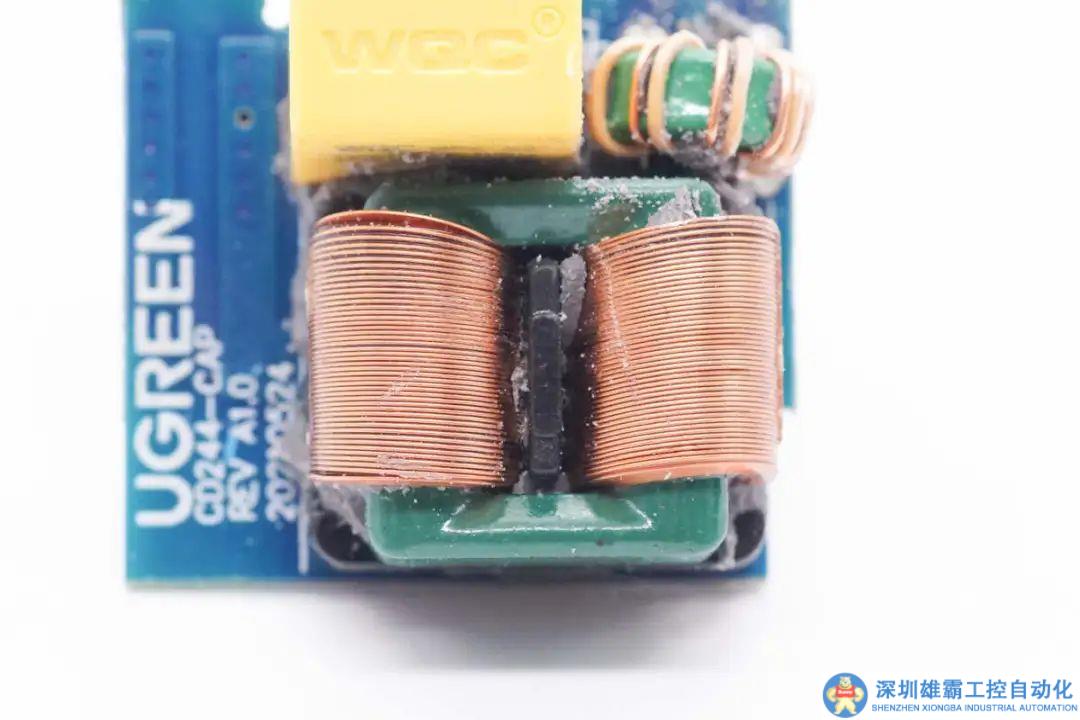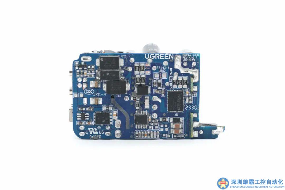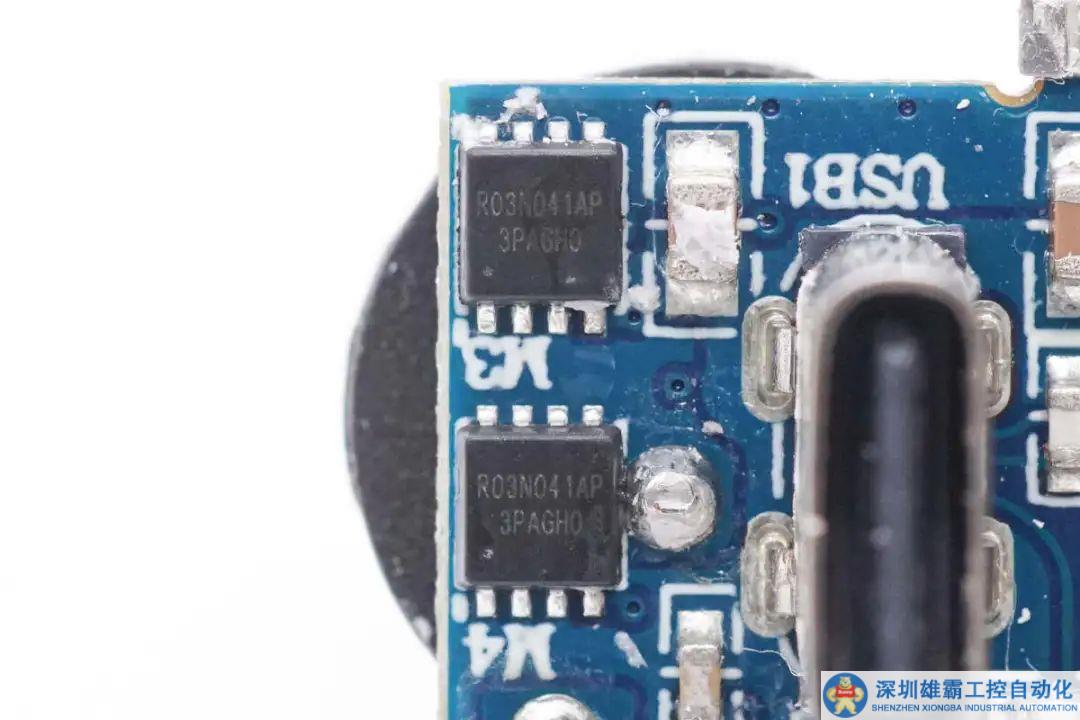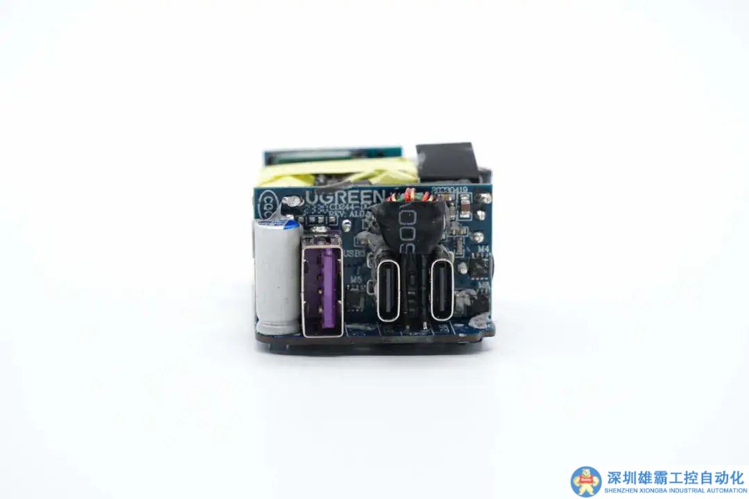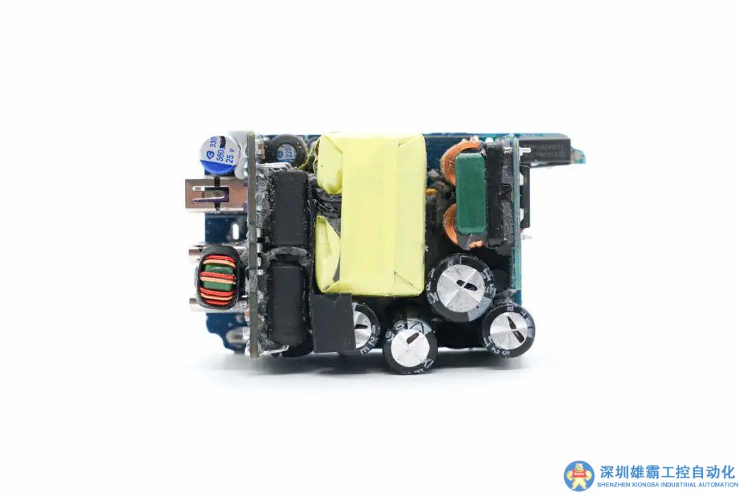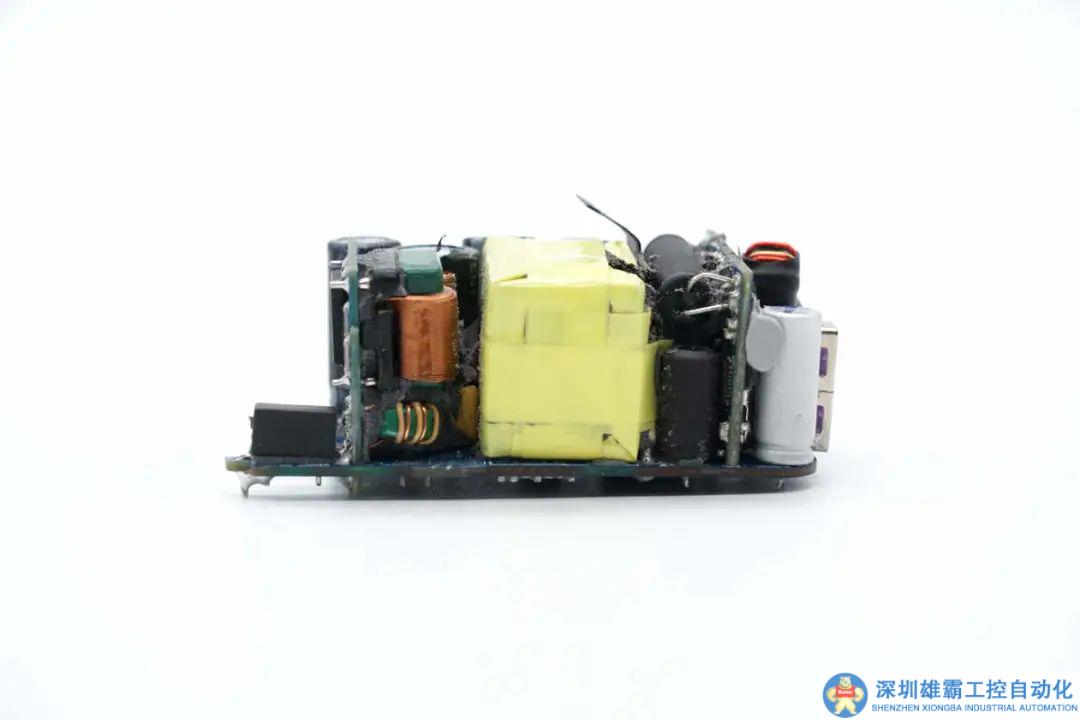 PCBA模塊背面一覽,焊接氮化鎵主控芯片,氮化鎵合封芯片,貼片Y電容,反饋光耦,同步整流控制器和同步整流管,初次級(jí)界限清晰。