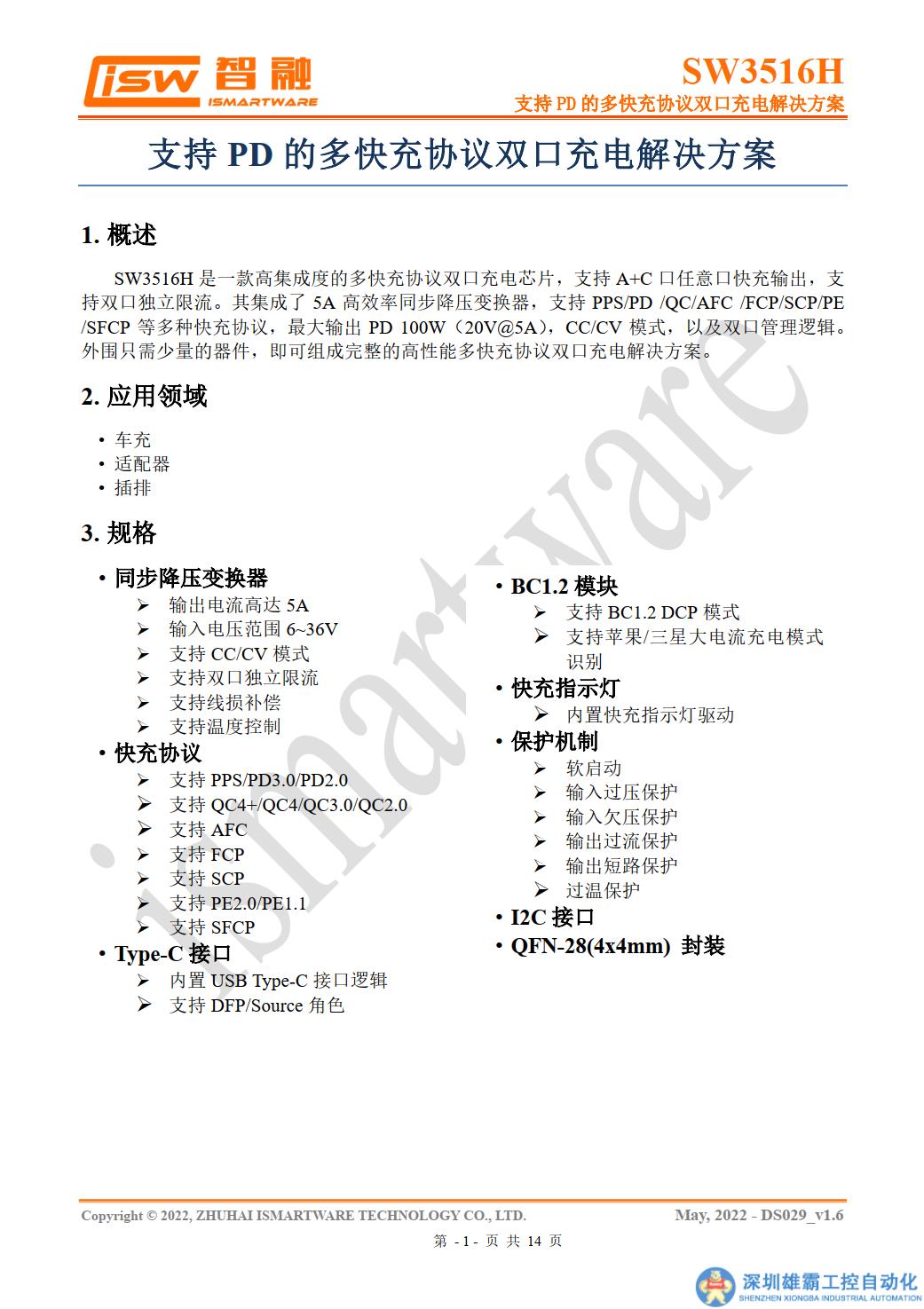 SW3516H集成了5A 高效率同步降壓變換器。支持PPS/PD/QC/AFC/FCP/SCP/PE/SFCP等多種快充協(xié)議,最大輸出PD 100W,CC/CV模式,以及雙口管理邏輯。外圍只需少量的器件,即可組成完整的高性能多快充協(xié)議雙口充電解決方案。